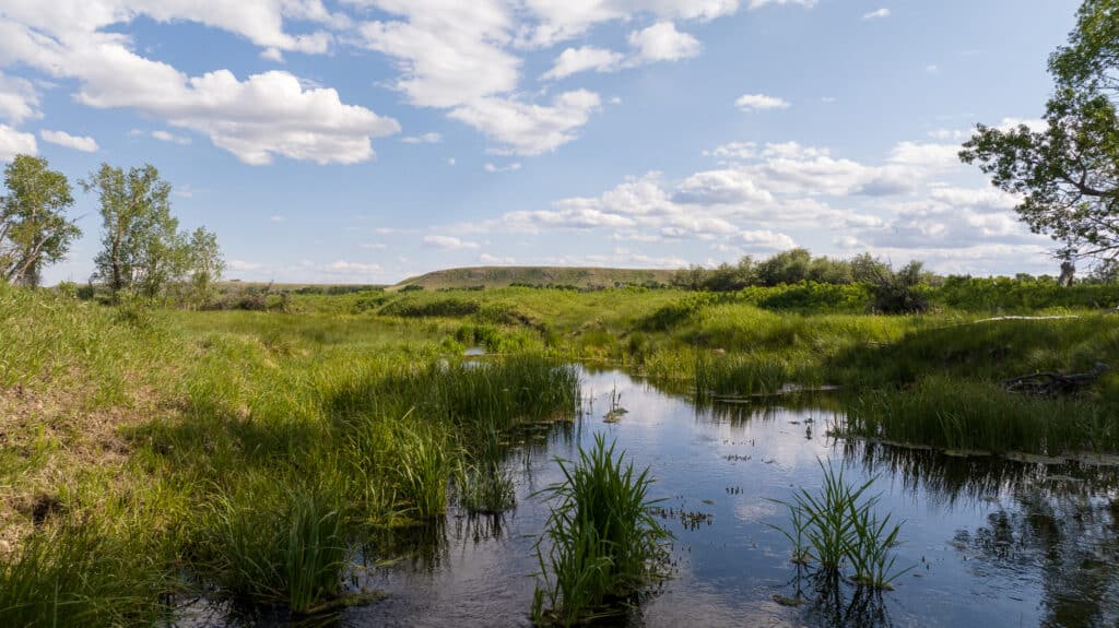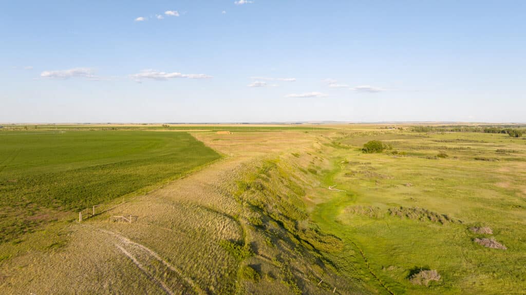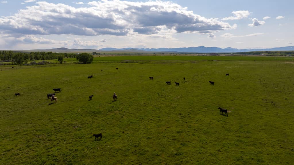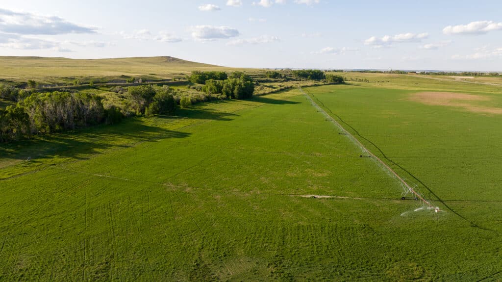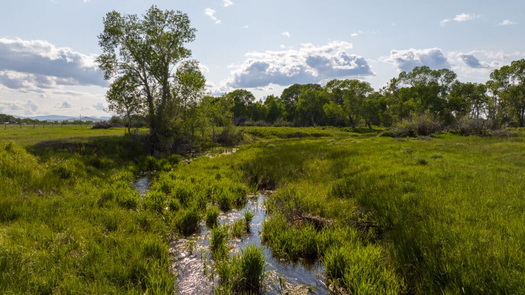 The ranch encompasses a diverse landscape that includes both improved and native pastures alongside sub-irrigated, flood-irrigated, wheel line, and pivot-irrigated hay and cropland. Lush riparian areas with cottonwood and aspen trees follow the natural streams and wetlands throughout the property, creating rich habitat corridors.