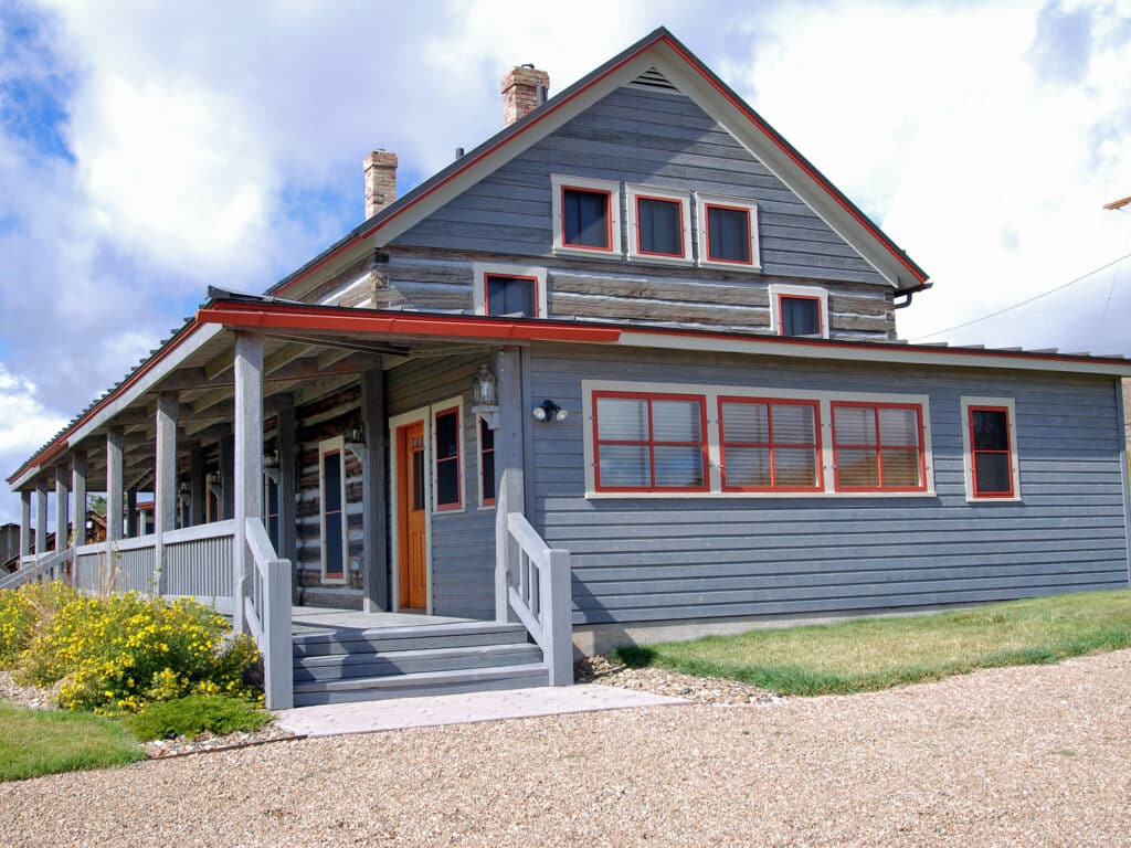 Originally the shack where Hamilton’s cowboy camped, the 500-square-foot Bunkhouse was totally gutted and refurbished. The well-designed layout incorporates plentiful storage into this small space. The use of reclaimed lumber maintains the rustic feel of the original structure. Heated with ___, the cabin with a new (what kind?) wood floor, has a kitchen, a small bedroom, a bathroom, and a small sitting area. The exterior has been restored including staining and re-chinking as well as a new roof. The furnishings here are from Little Bear Interiors in Bozeman.