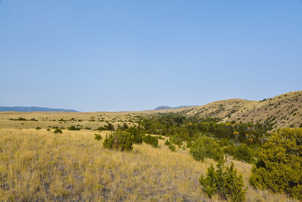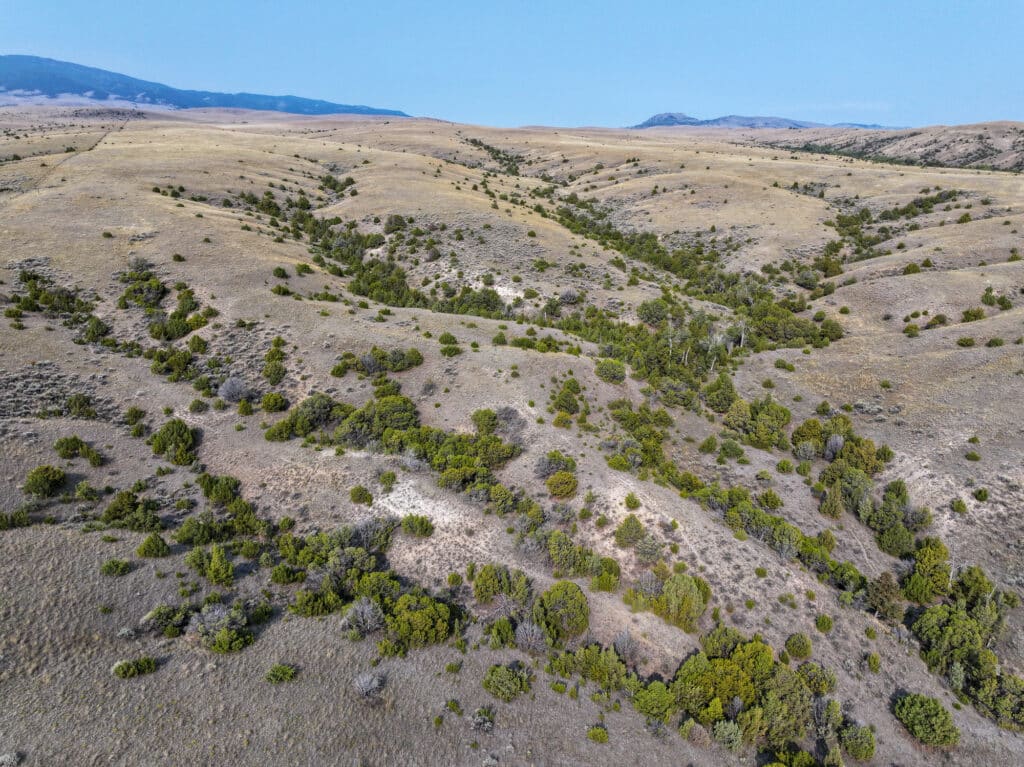 The terrain consists of well-defined native grasslands dotted with junipers and sagebrush across gently rolling to moderately steep topography. Several ridgelines cut through the property, creating deep drainages filled with conifers, cottonwoods, and deciduous trees that provide natural shade and shelter. This diverse landscape has historically supported cattle grazing under lease agreements and serves as prime habitat for local wildlife, particularly antelope.