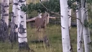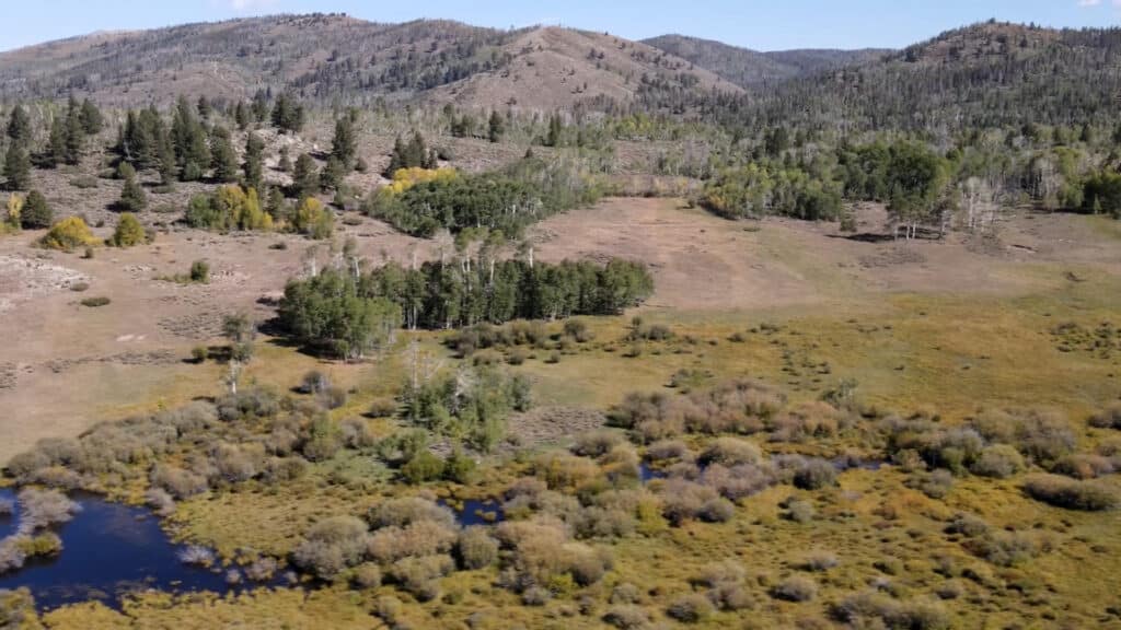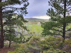Trees on the ranch include lodgepole pine, quaking aspen, ponderosa pine, cottonwood, and willows. These trees provide incredible protection and habitat for all local wildlife. The green and riparian areas have a variety of grass as well that provide feed for both livestock and wildlife.
