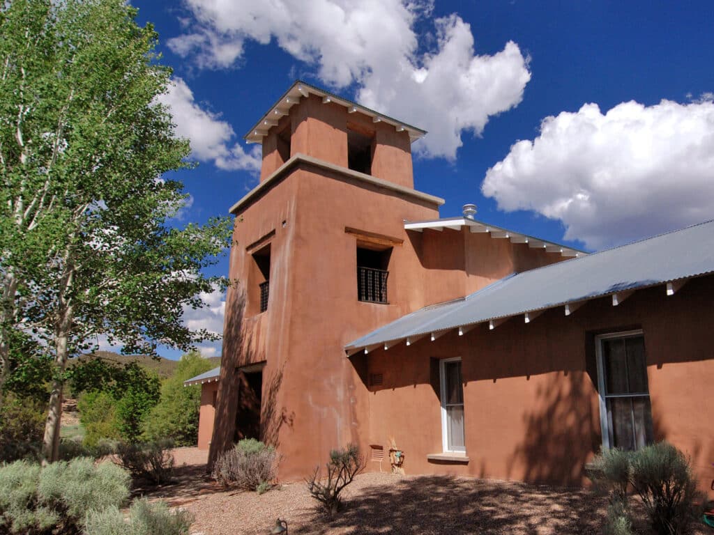 In the early 1960s under the ownership of Texas oil tycoon Buddy Fogelson and his wife, film actress Greer Garson, the Hacienda and barn were designed by renowned New Mexico architect John Gaw Meem on his signature Pueblo Revival design. Fonda maintained this distinctive style in the reconstruction of the Hacienda and the renovation of the barn as a twelve-stall equestrian stable. The equestrian facilities are functional and well maintained, and together with the adjoining paddocks and healthy native pastures could comfortably handle a sizable remuda or a few personal saddle horses.