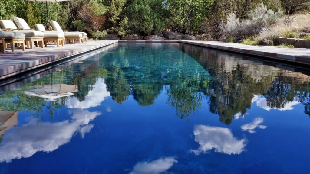 Stepping stones lead from River House to the 20¢ x 60¢ swimming pool located in a secluded oasis surrounded by ornamental gardens and trees. The non-chorine pool has a natural filtration system and is beautifully designed with native-stone pavers surrounding the perimeter of the pool.