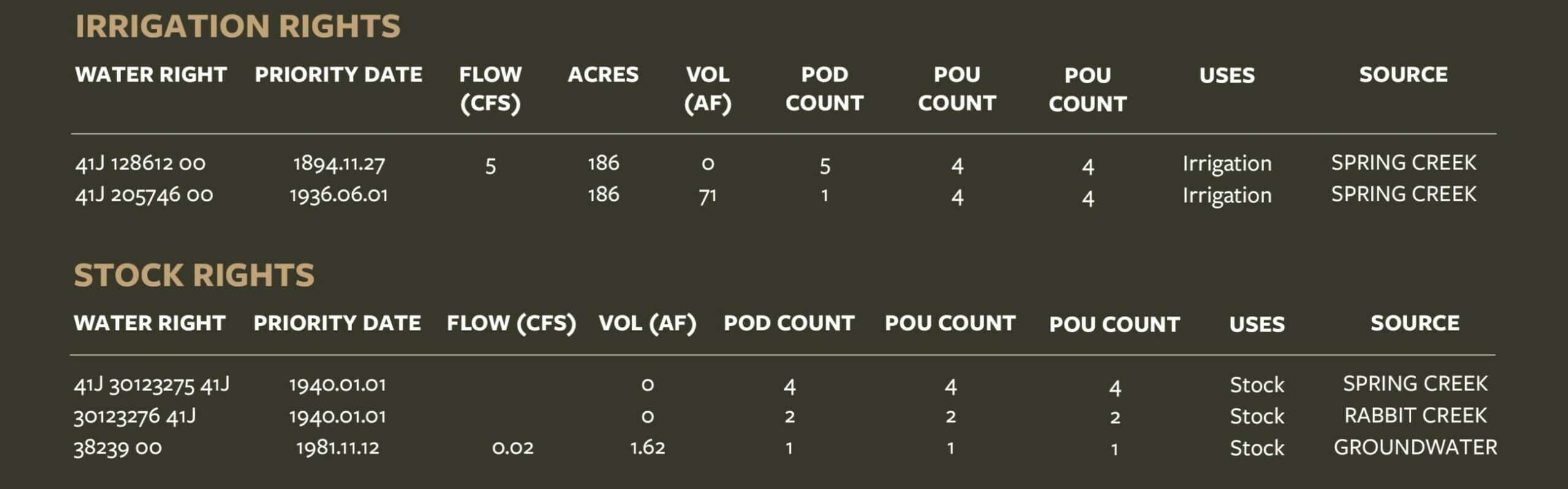 According to the Department of Natural Resources and Conservation, McGuire Spring Creek Ranch owns two irrigation water rights and three stock rights. For additional information regarding the water rights, please contact listing agent Stephen Leibinger at 406.451.1188.