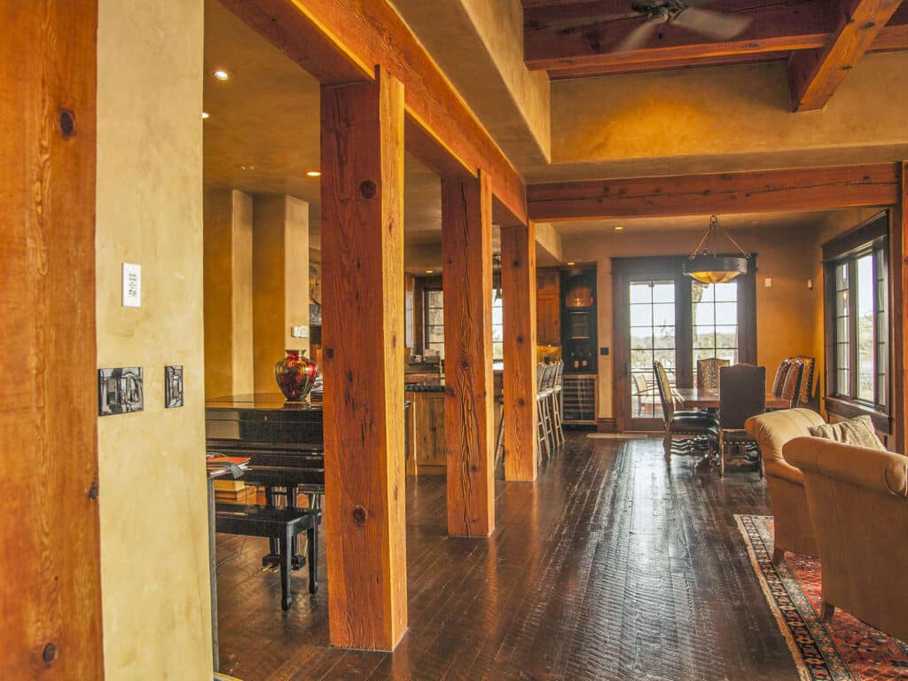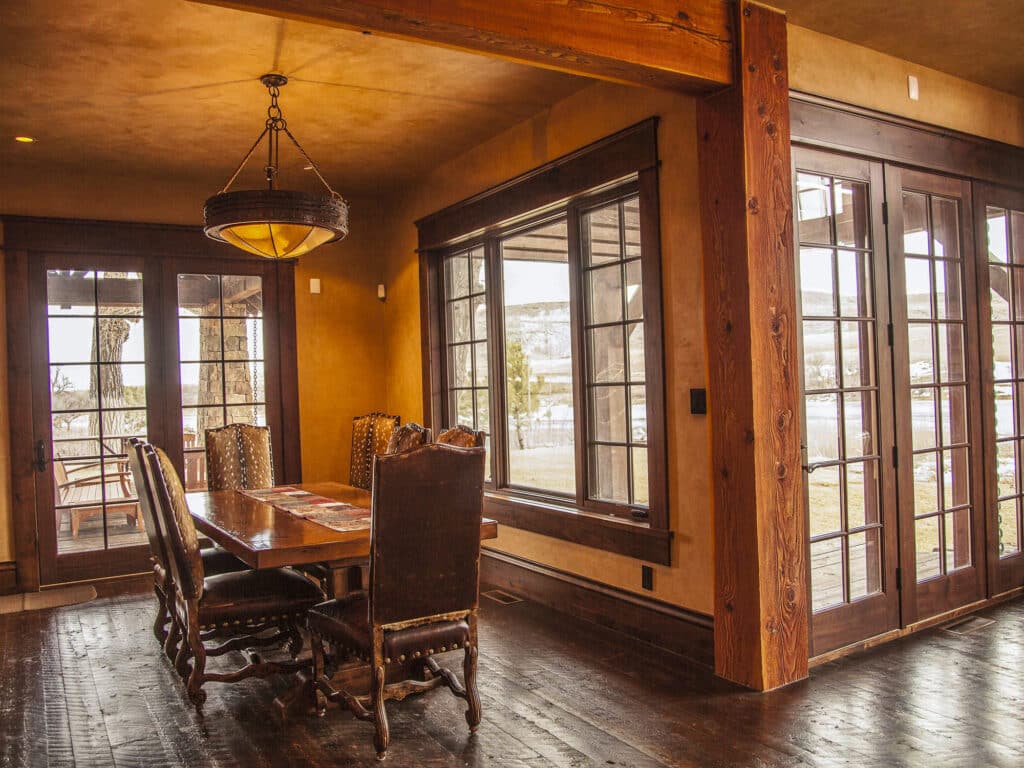The great room is the core of the home and the dramatic Chief Joseph stone fireplace with a massive hearth and hand-wrought iron fireplace doors create a natural gathering place to relive the day and plan the next adventure. The architectural details include a rustic coffered ceiling framed with square-cut timbers that create a dramatic effect. A grand piano completes the space.