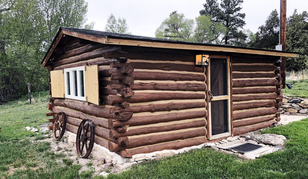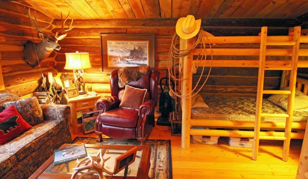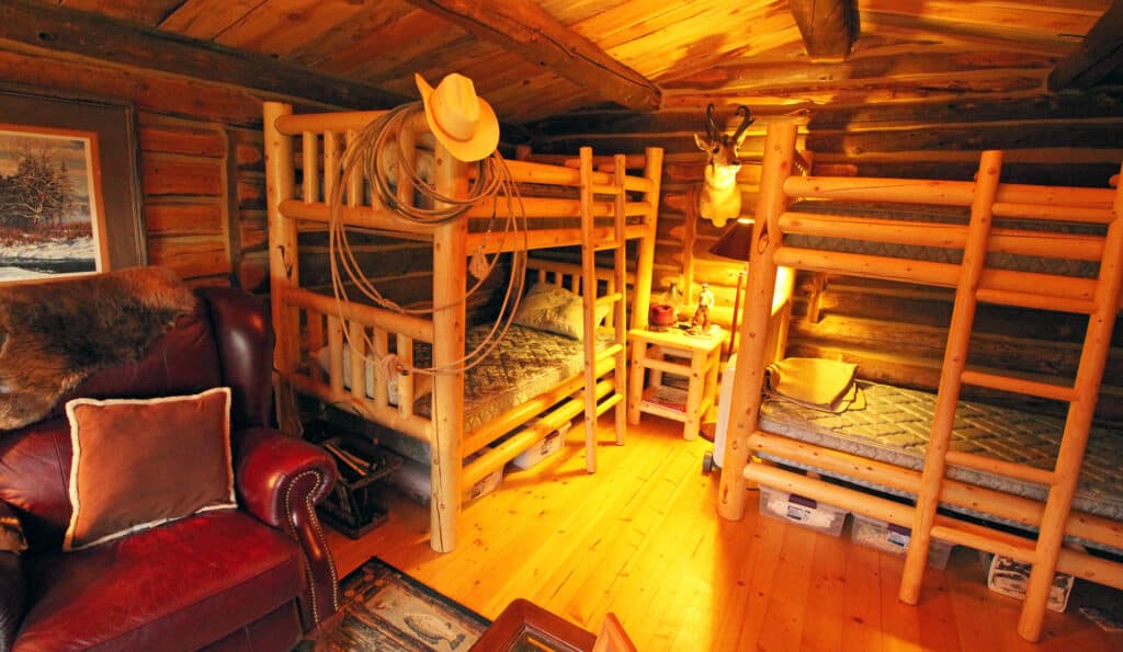 The restored one-room bunkhouse, which can sleep up to six people, is very cozy with two bunk beds, a sleeper sofa, two recliners, a coffee table, and a refrigerator. The cabin has electricity with electrical outlets and lights. The cabin does not have running water.