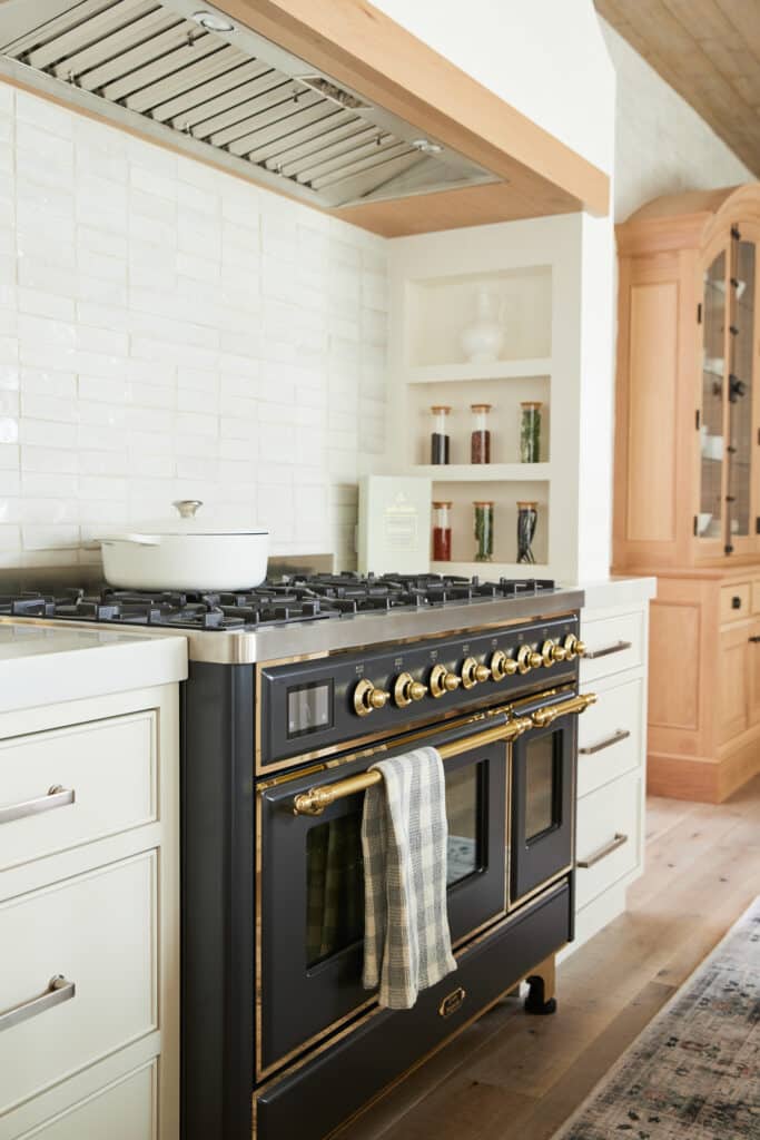 At the heart of the home is a stunning chef’s kitchen featuring subway tile walls, custom cabinetry, and a dramatic plaster hood over the dual-fuel Ilve Majestic oven with eight gas burners. A polished marble island with seating for four provides ample workspace and room to gather. Just beyond the kitchen is a built-in dining area with comfortable, casual seating for six. A larger farm table offers flexibility to host more formal moments and large-scale hospitality. Custom cabinetry, artisan lighting, and hand-picked designer rugs and furniture elevate the entire space.