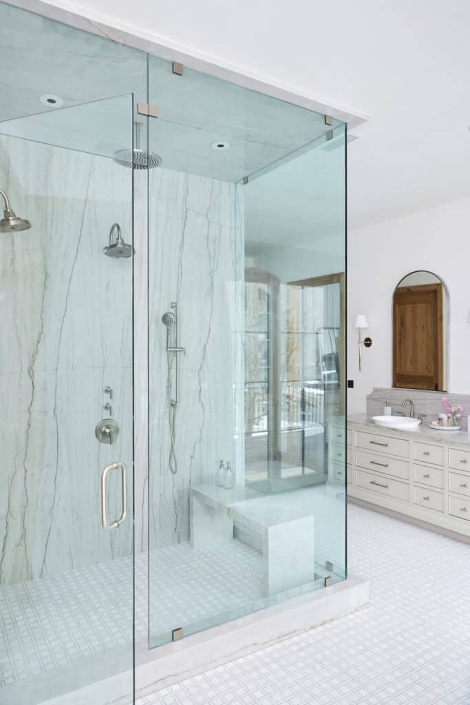 The guest suite bathrooms reflect the same elevated design as the rest of the home, blending classic French-inspired elements with modern functionality. Every detail, from the marble-topped vanities to tilework and lavish towels, contributes to a spa-like guest experience.