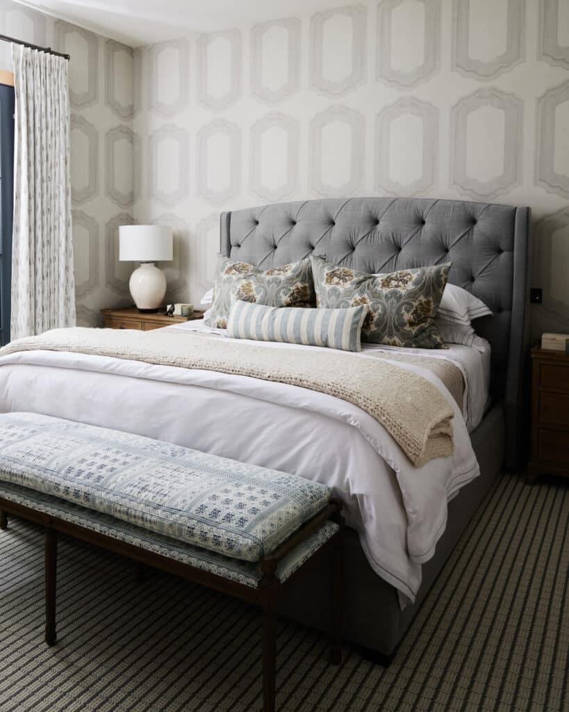 The main level has the first of two luxurious guest suites in the home, both of which have ensuite baths. These guest suites feature soft, neutral tones that create a warm and inviting atmosphere, complemented by custom upholstered headboards and benches at the foot of the bed, which pair well with wall treatments and deluxe linens. The windows frame peaceful mountain views, and the guest rooms are designed with privacy and relaxation in mind, ensuring a five-star experience for family and visitors alike.