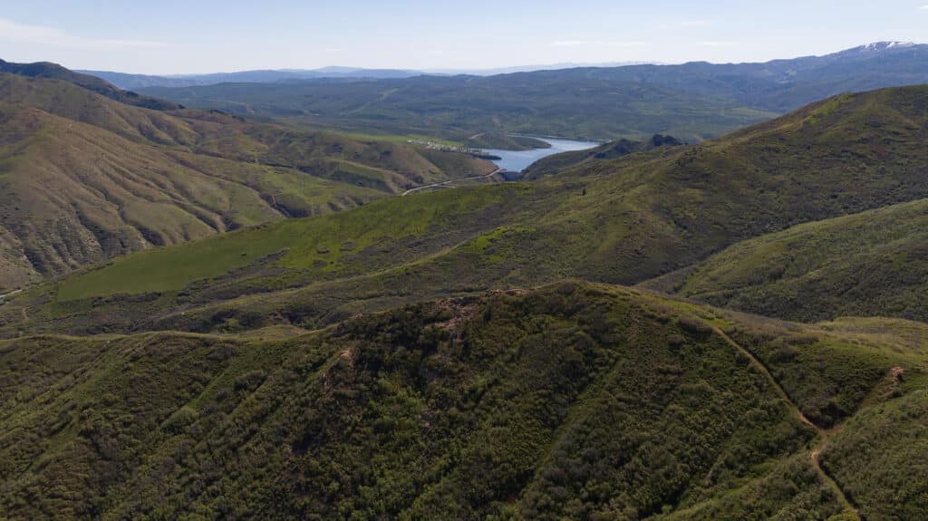 As you continue climbing near the southern border of the ranch, the journey gets more dramatic, and the expansiveness of the Sheep Creek Canyon experience completely sets in. There are several prominent ridgelines, and the highest point on the ranch is mapped at 8,376 feet in elevation. The views of the Wasatch Range to the west, regionally significant Lewis Peak to the east, and Park City to the south are some of the most spectacular you’ll encounter anywhere in Utah. The massive stands of aspen trees, scrub oaks, birch trees, cottonwoods, and dense stands of fir trees provide an incredible and ever-changing palette of colors throughout the seasons. The road network offers access to the elevated eastern portion of the ranch, which sits at about 7,500 feet and exposes a stunning bench overlooking the East Canyon Reservoir and mountain peaks on the horizon in every direction.