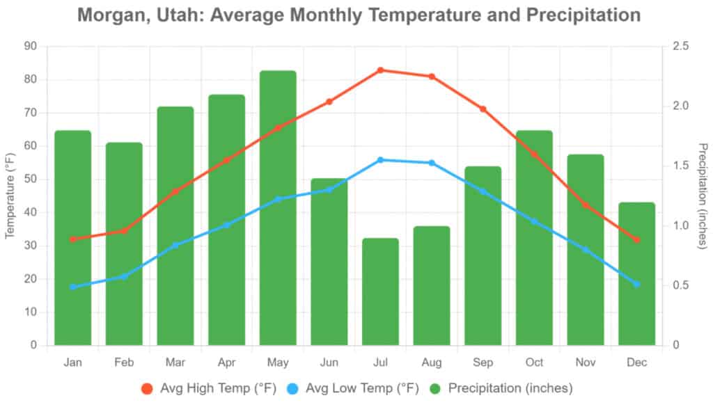 Morgan, Utah, has a semi-arid climate with four distinct seasons, characterized by hot, dry summers and snowy winters.