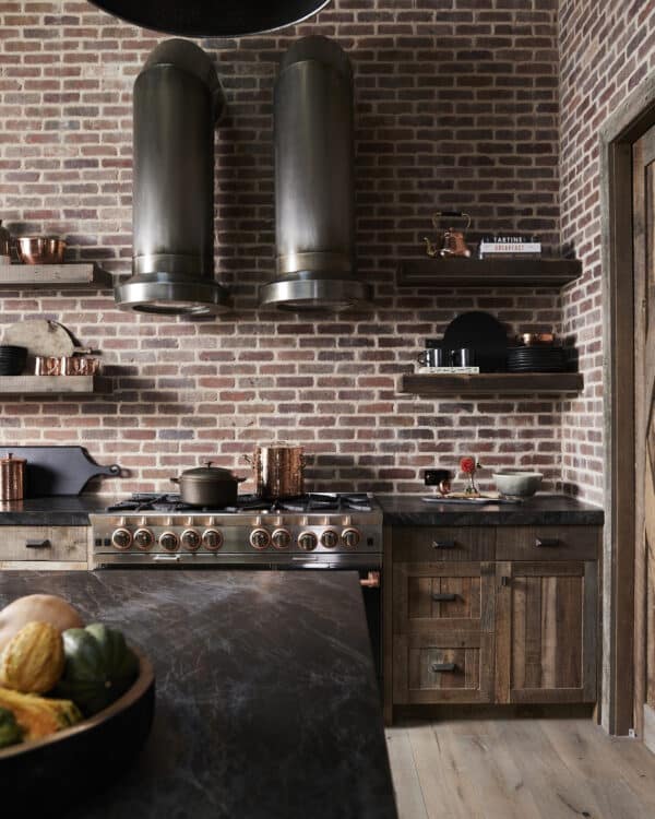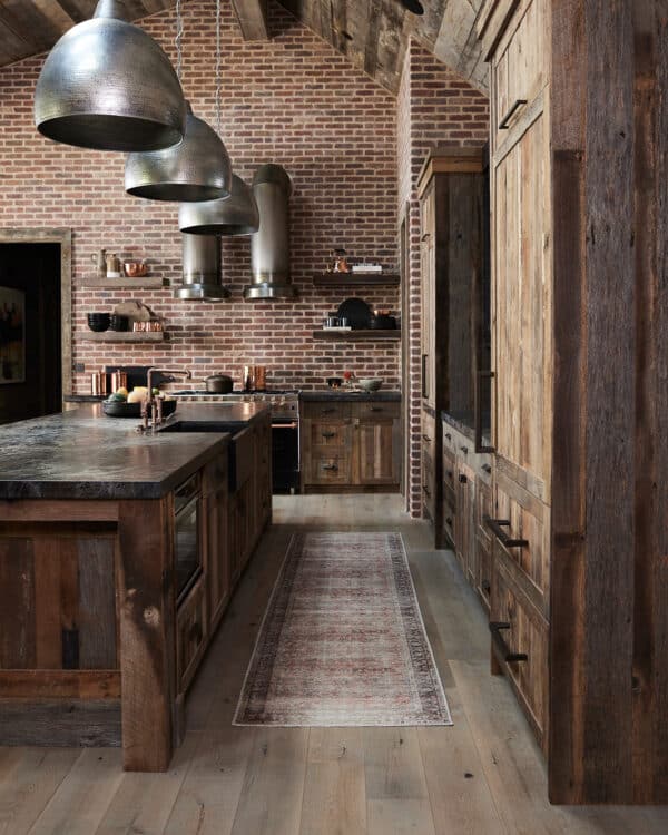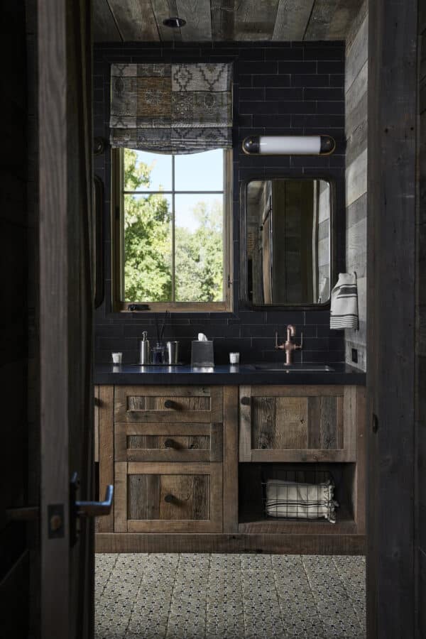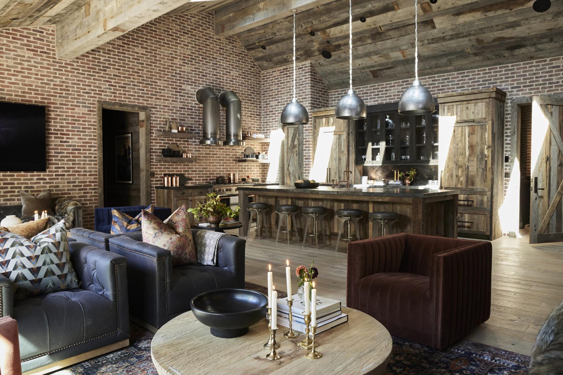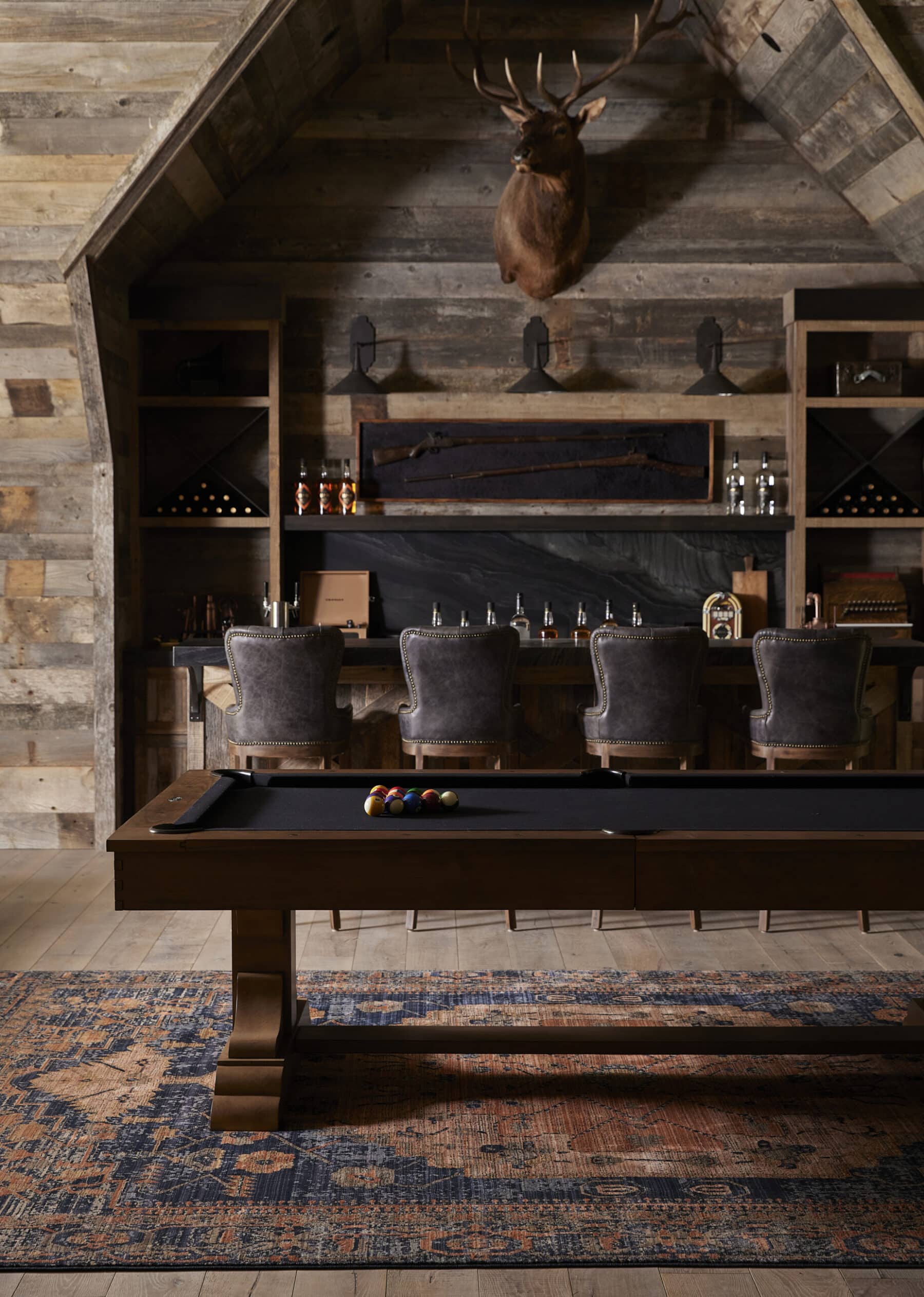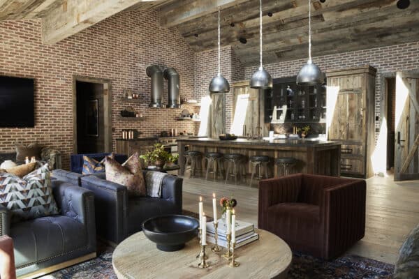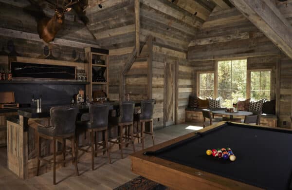 The reclaimed wood ceiling with hand-hewn beams adds warmth, depth, and a sense of grounded, organic elegance. A dramatic chef-grade bar and kitchen space has custom industrial-style ventilation hoods over a pro-style range, accompanied by slate counters and hammered artisan pendant lights. The seating area features plush velvet and leather club chairs that balance the room’s raw materials with designer finishes. A mounted bull elk and framed antique rifle serve as the centerpiece above the bar, underscoring the ranch’s connection to its wild surroundings and world-class elk hunting grounds with nods to the history of the American West.
