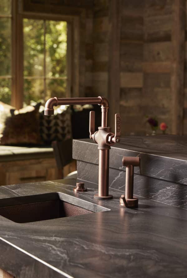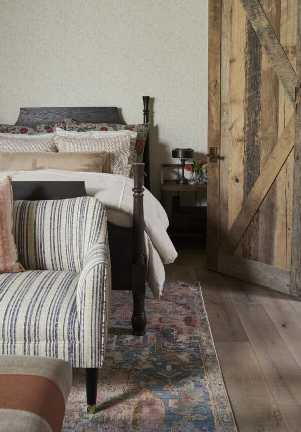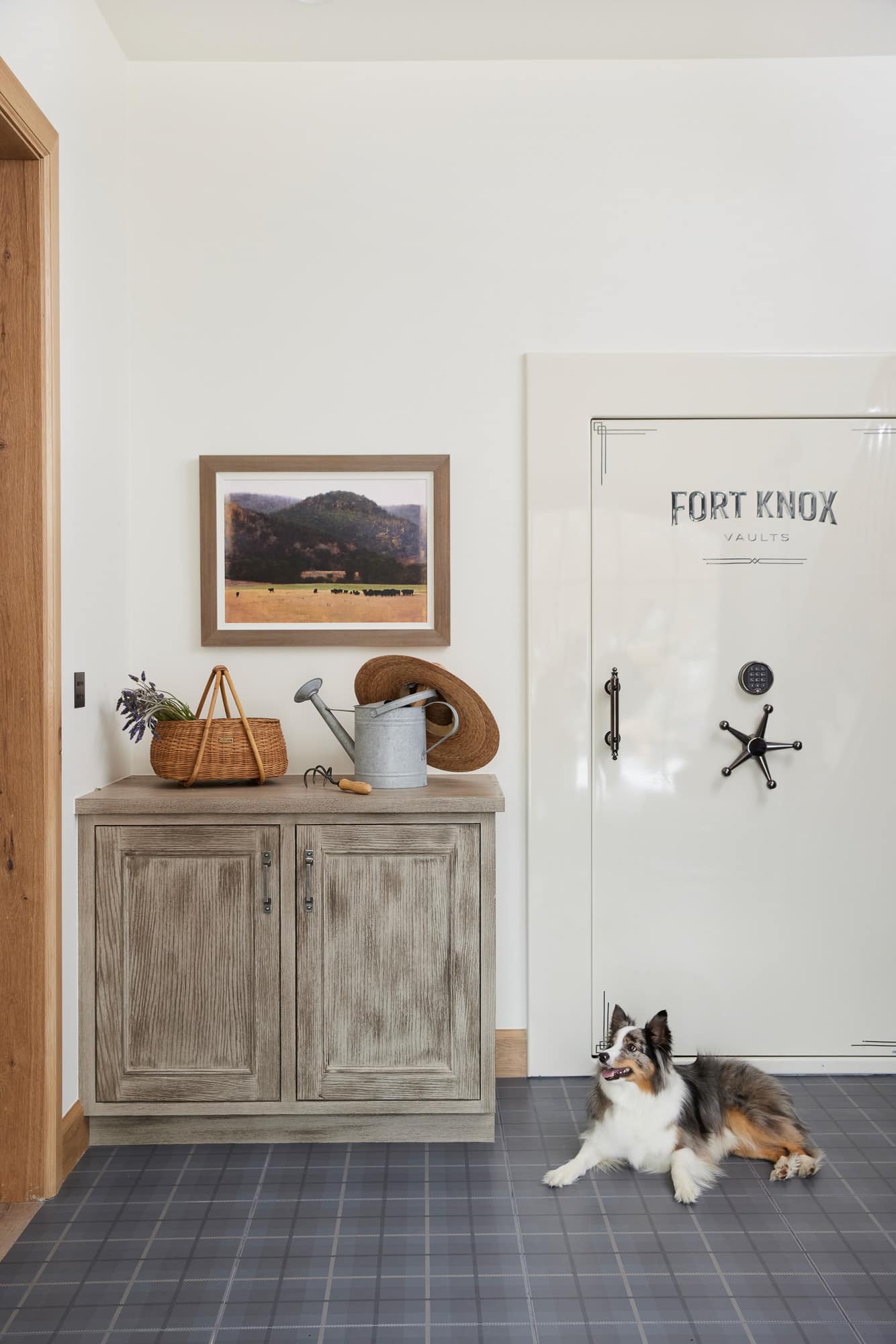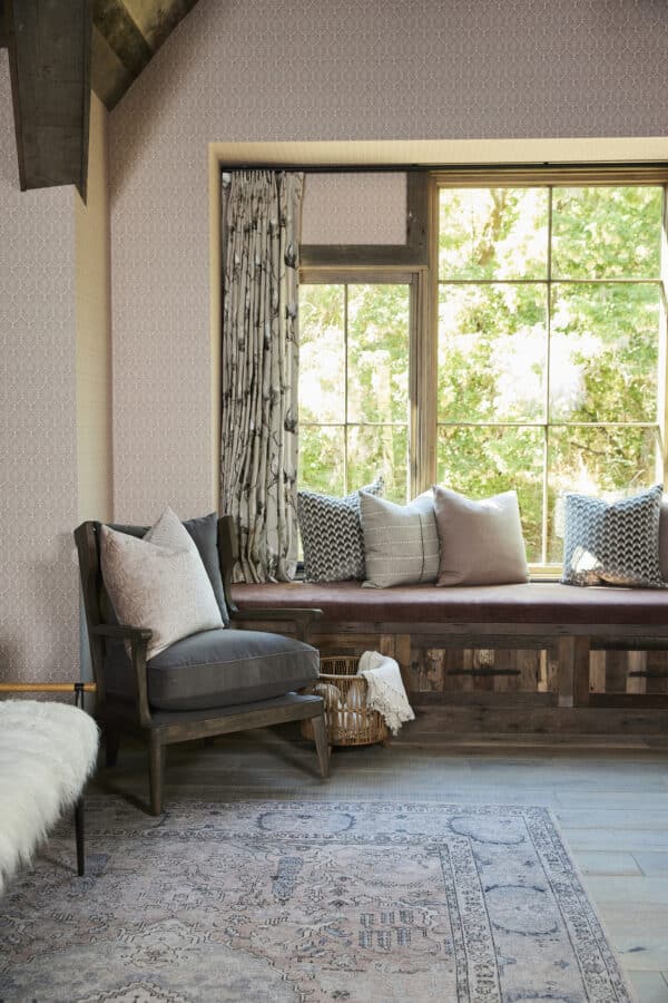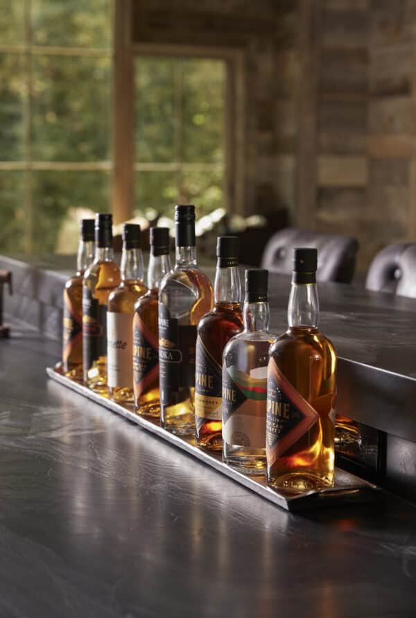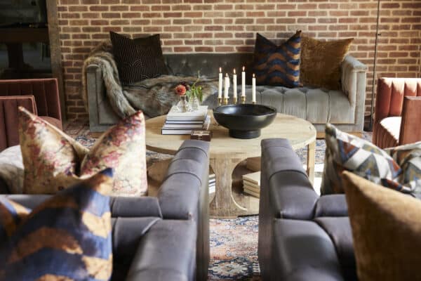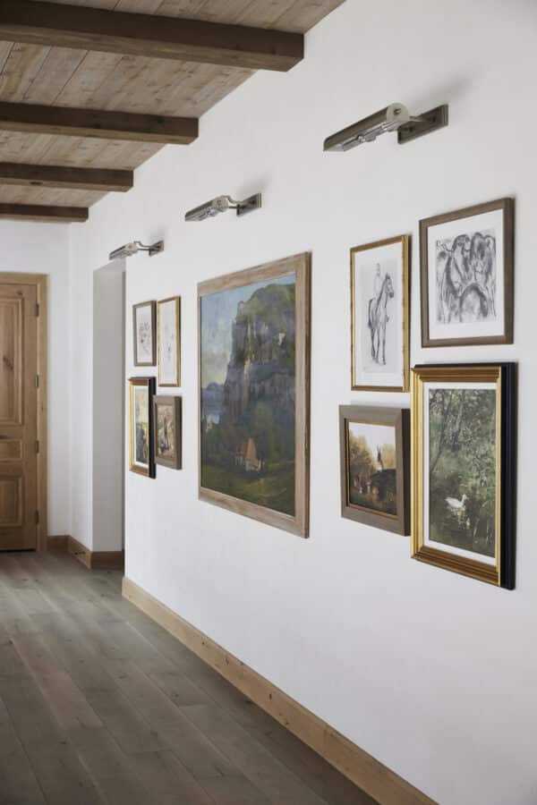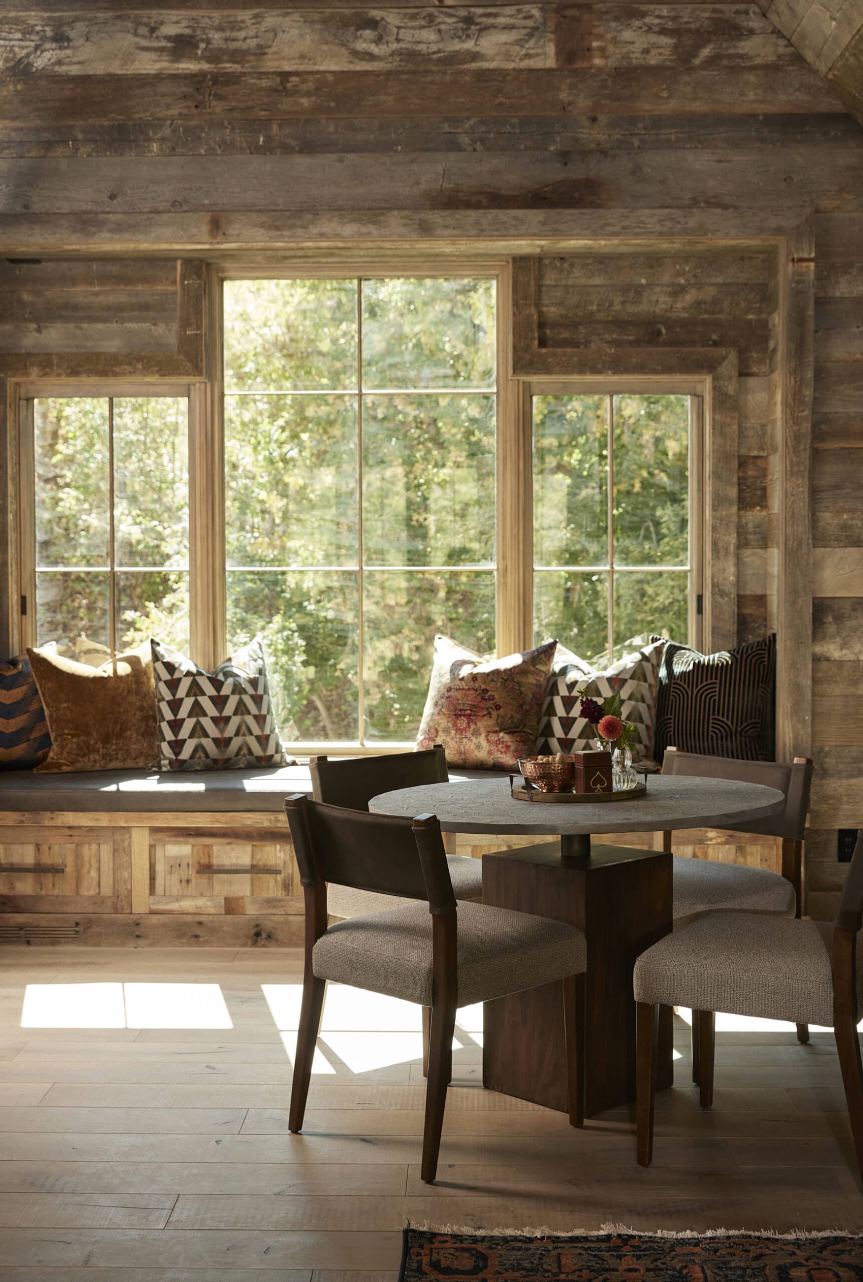 The reclaimed wood ceiling with hand-hewn beams adds warmth, depth, and a sense of grounded, organic elegance. A dramatic chef-grade bar and kitchen space has custom industrial-style ventilation hoods over a pro-style range, accompanied by slate counters and hammered artisan pendant lights. The seating area features plush velvet and leather club chairs that balance the room’s raw materials with designer finishes. A mounted bull elk and framed antique rifle serve as the centerpiece above the bar, underscoring the ranch’s connection to its wild surroundings and world-class elk hunting grounds with nods to the history of the American West.
