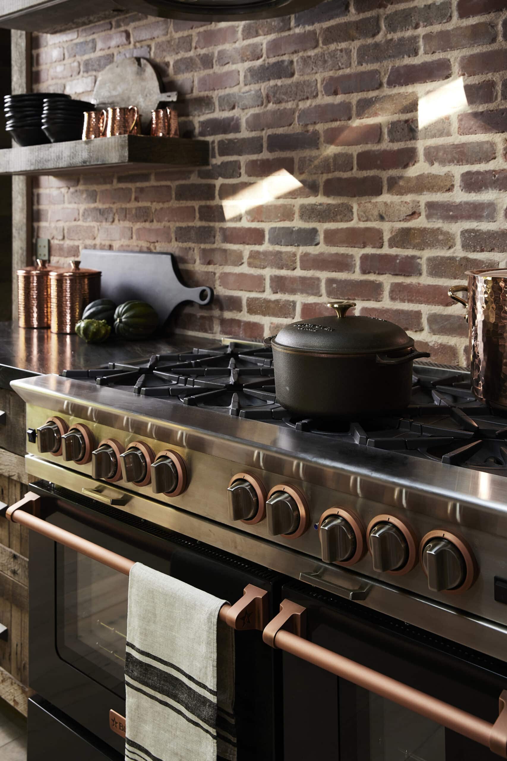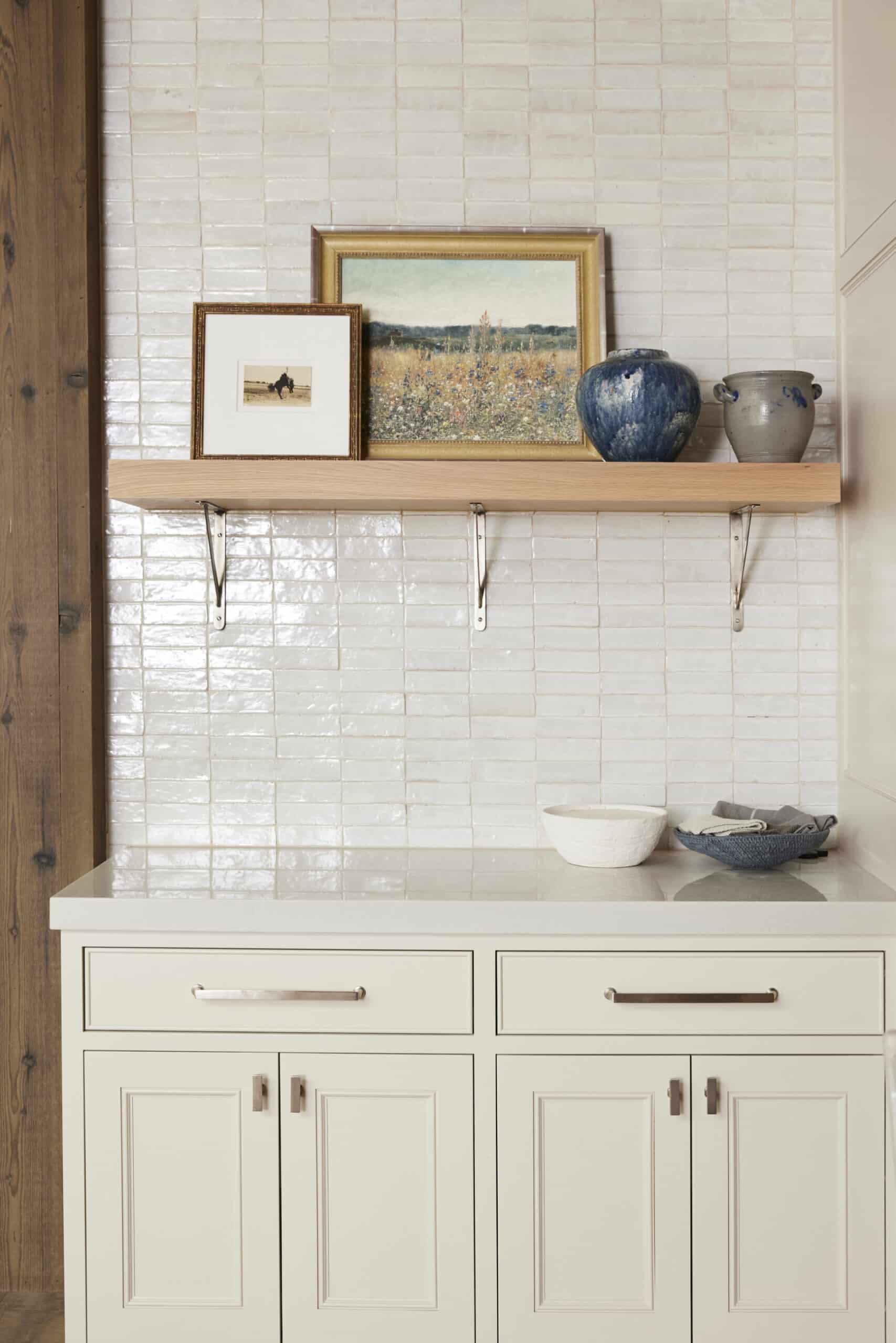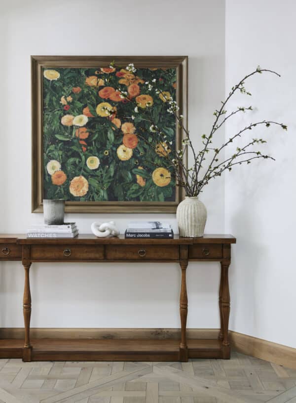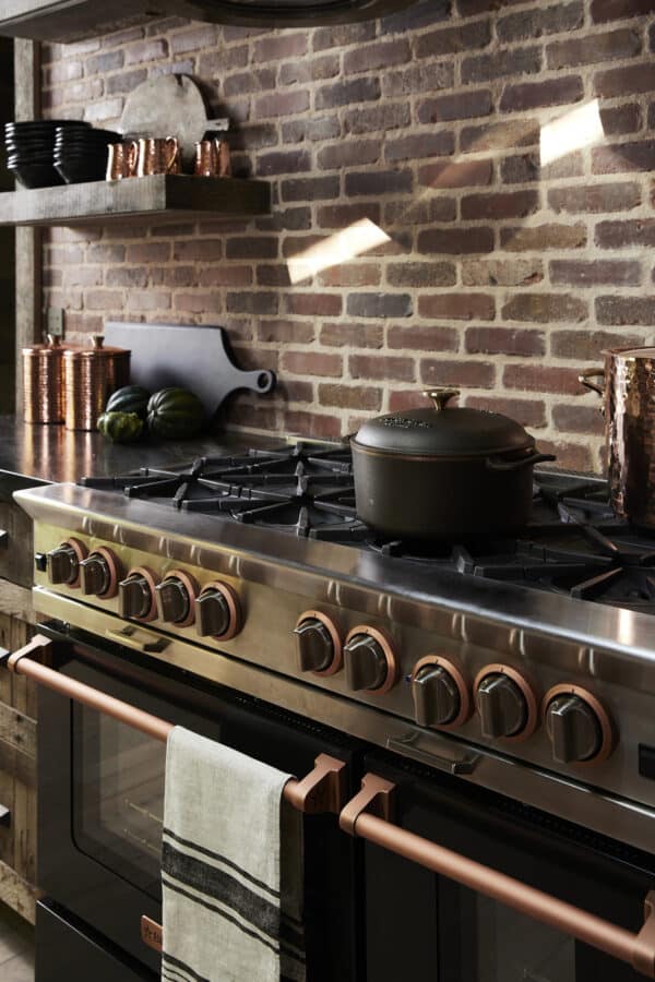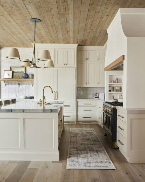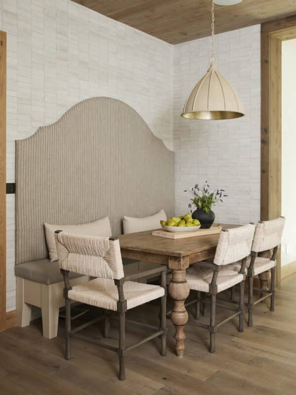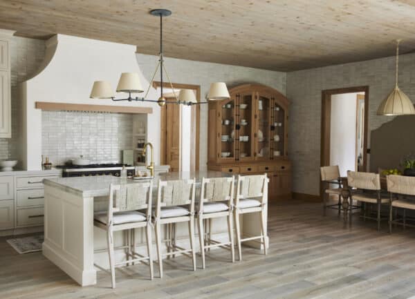 At the heart of the home is a stunning chef’s kitchen featuring subway tile walls, custom cabinetry, and a dramatic plaster hood over the dual-fuel Ilve Majestic oven with eight gas burners. A polished marble island with seating for four provides ample workspace and room to gather. Just beyond the kitchen is a built-in dining area with comfortable, casual seating for six. A larger farm table offers flexibility to host more formal moments and large-scale hospitality. Custom cabinetry, artisan lighting, and hand-picked designer rugs and furniture elevate the entire space.