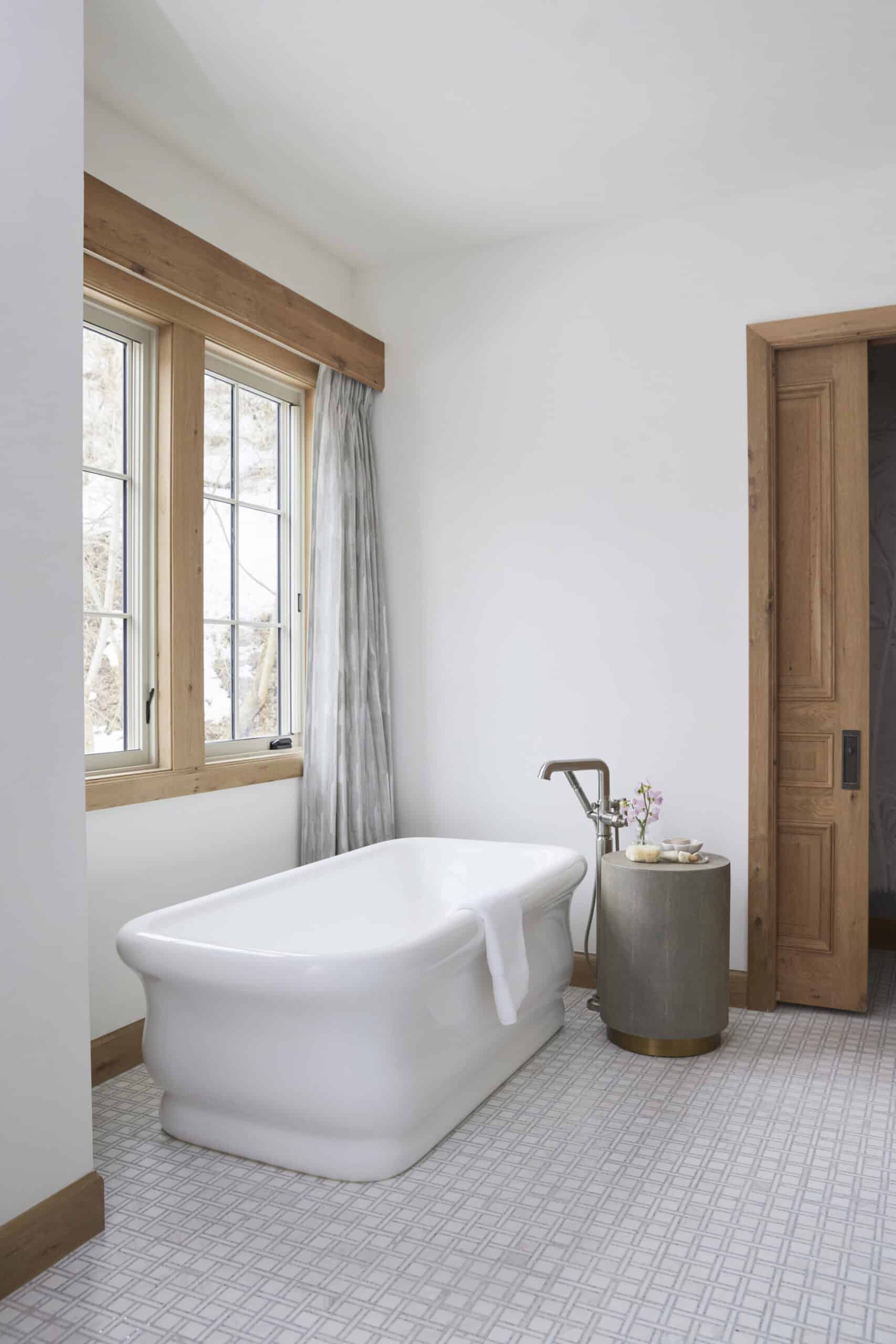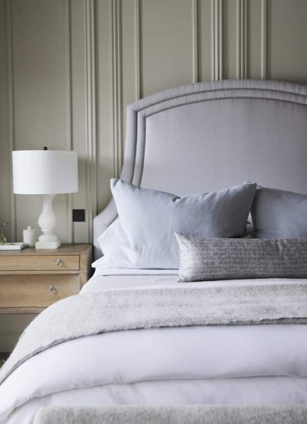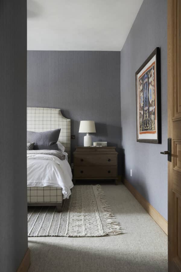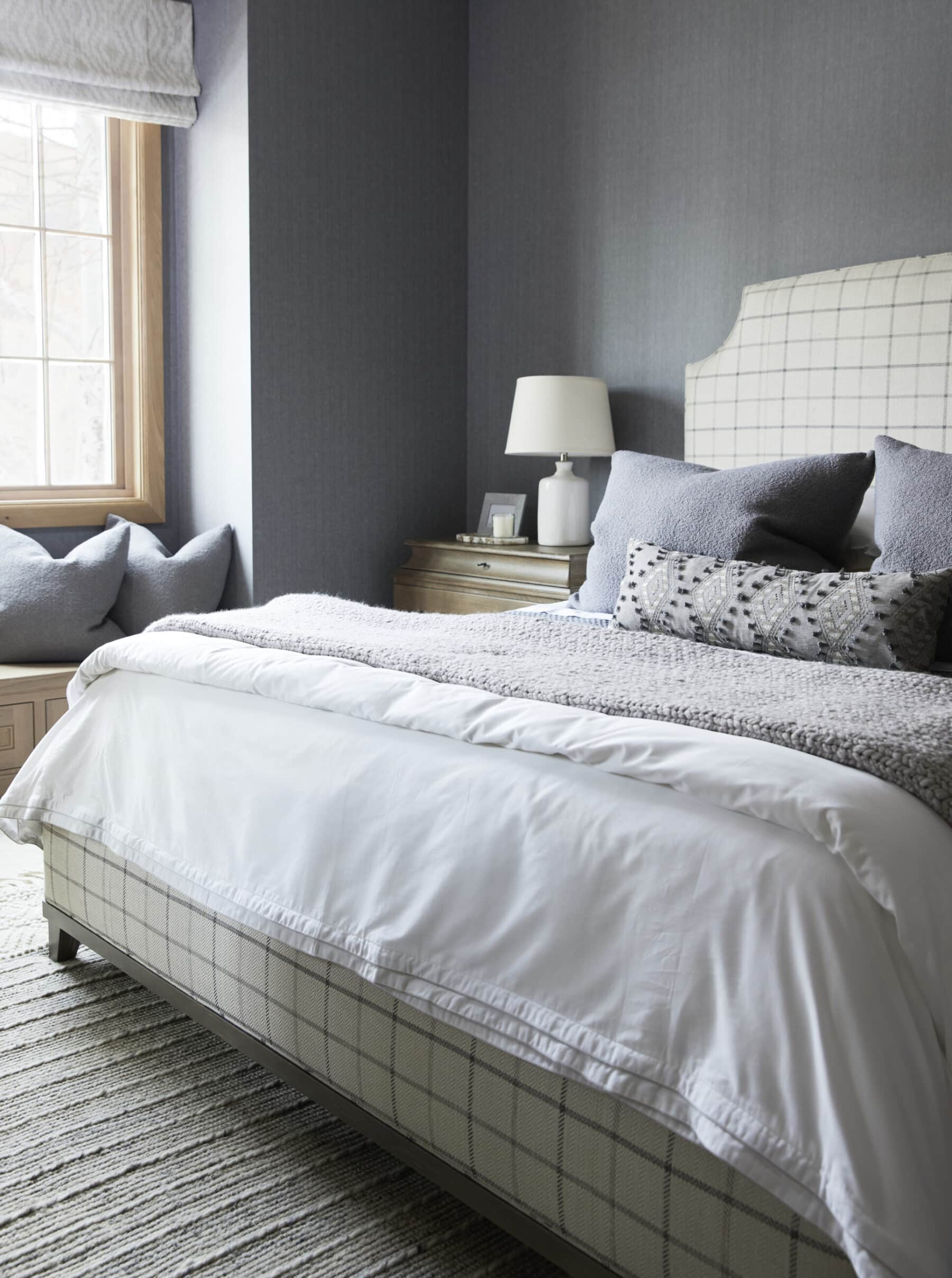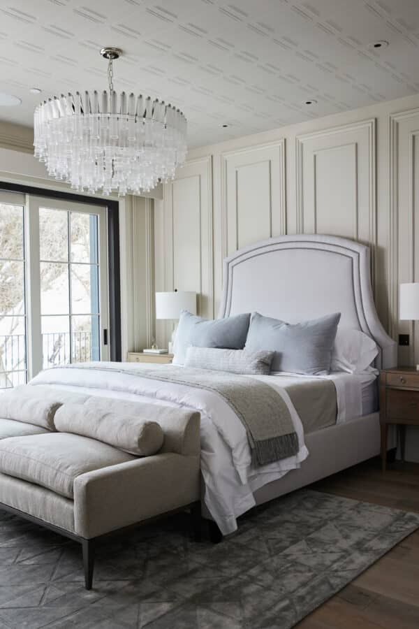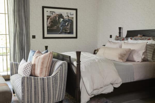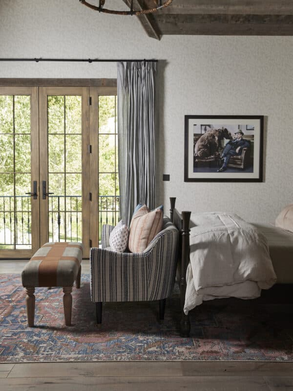 The main level has the first of two luxurious guest suites in the home, both of which have ensuite baths. These guest suites feature soft, neutral tones that create a warm and inviting atmosphere, complemented by custom upholstered headboards and benches at the foot of the bed, which pair well with wall treatments and deluxe linens. The windows frame peaceful mountain views, and the guest rooms are designed with privacy and relaxation in mind, ensuring a five-star experience for family and visitors alike.
