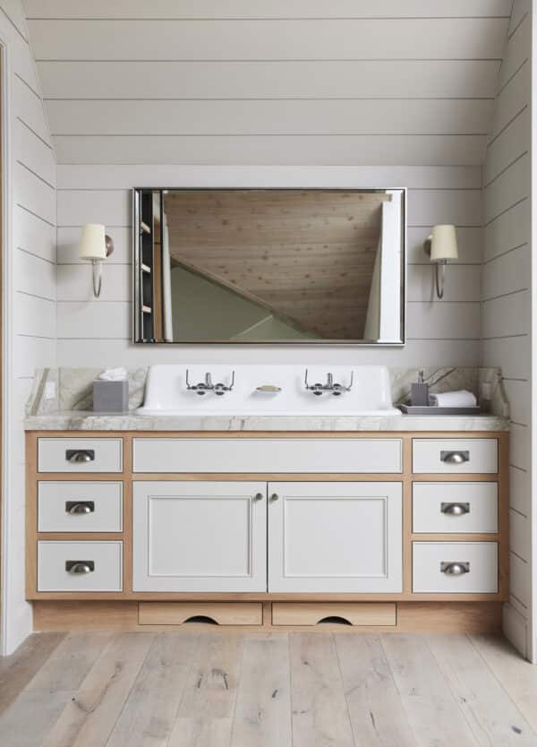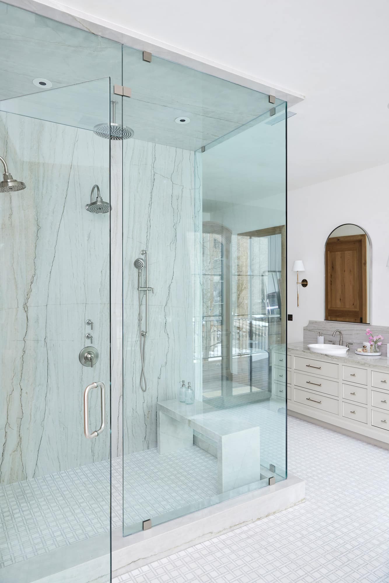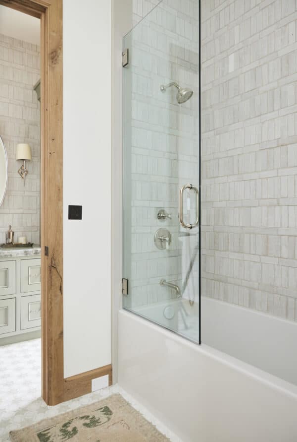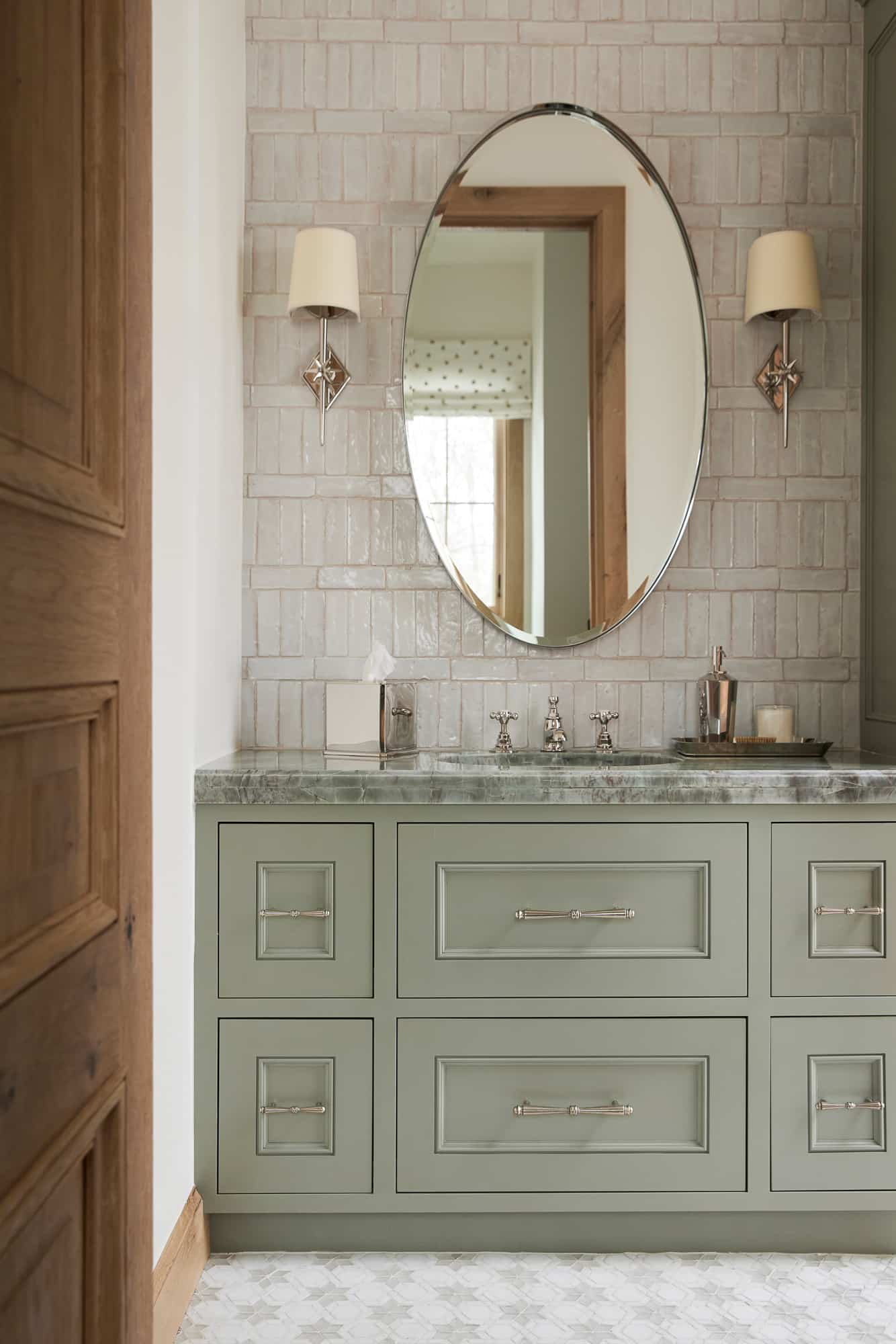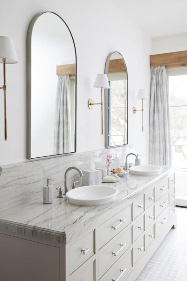 The guest suite bathrooms reflect the same elevated design as the rest of the home, blending classic French-inspired elements with modern functionality. Every detail, from the marble-topped vanities to tilework and lavish towels, contributes to a spa-like guest experience.