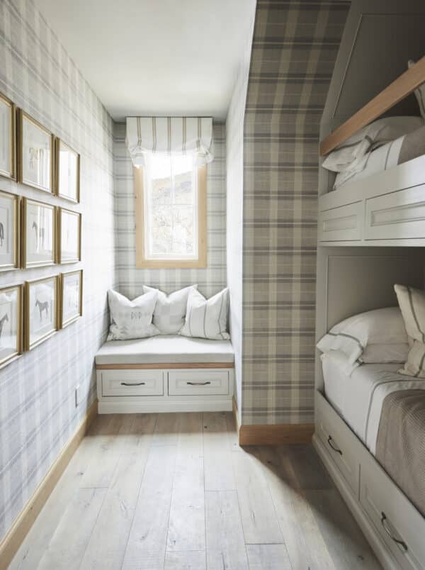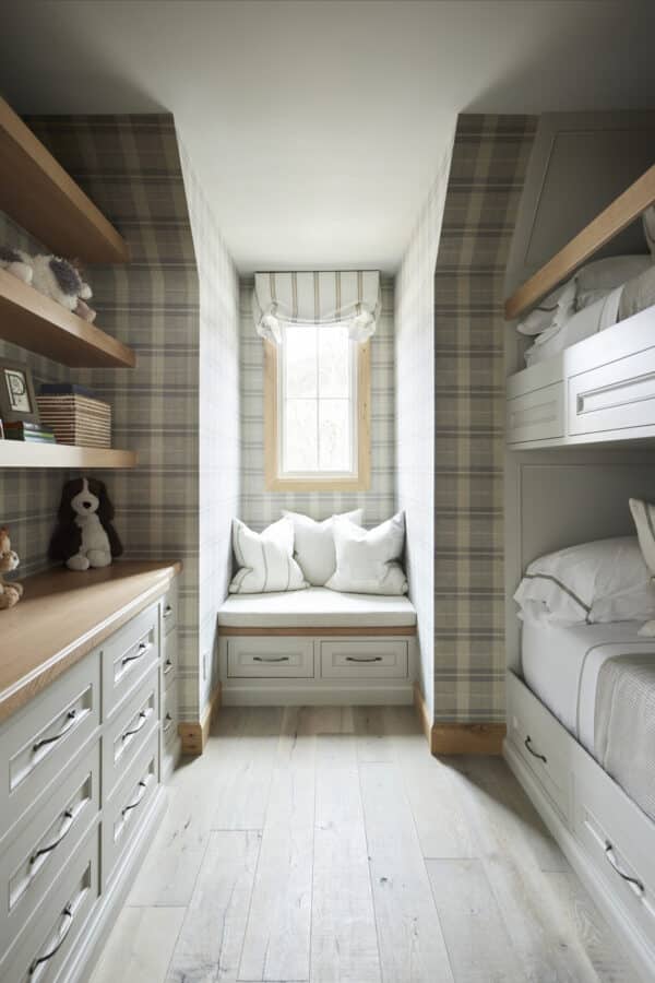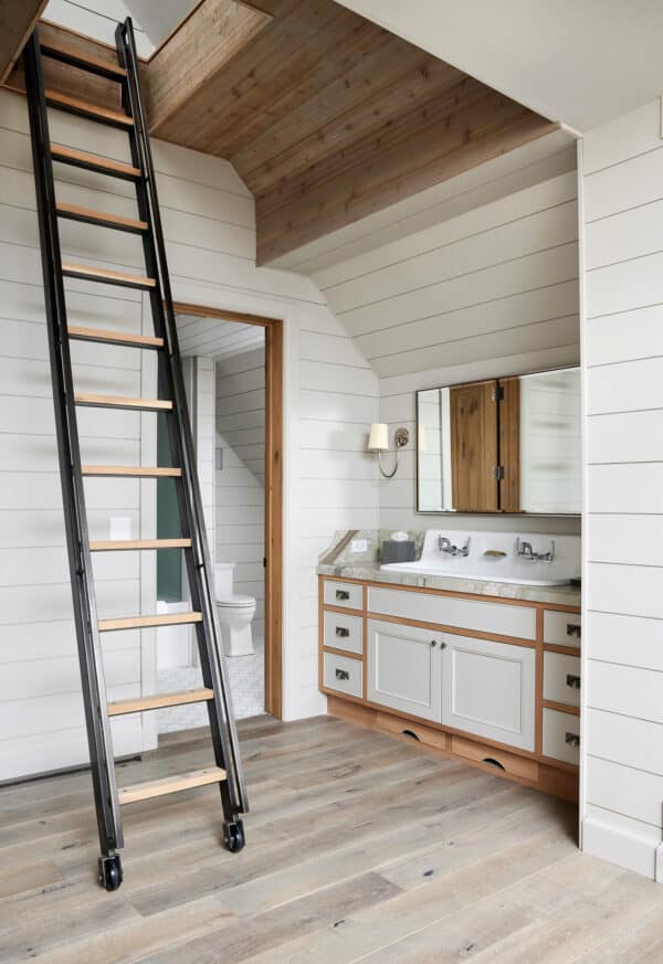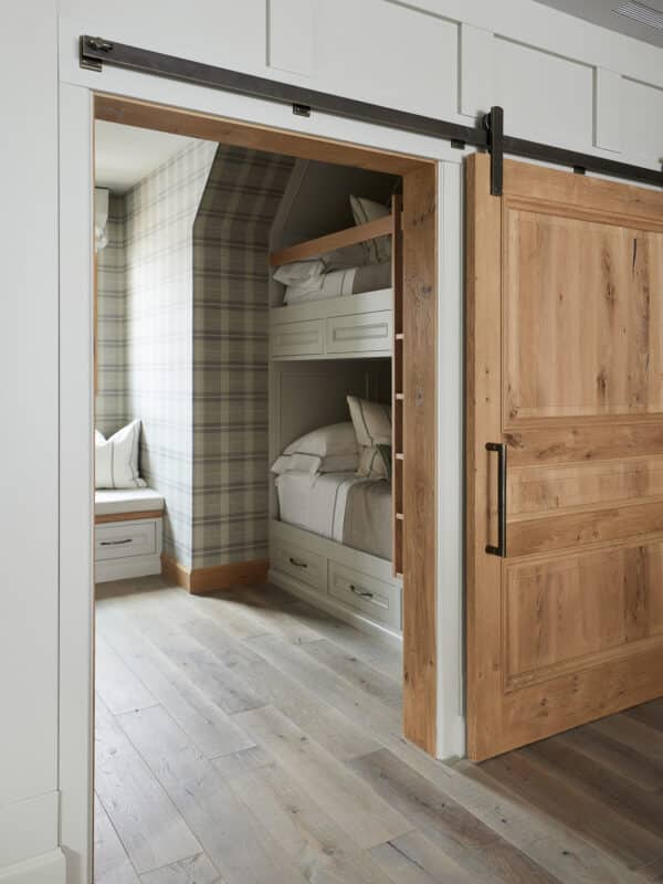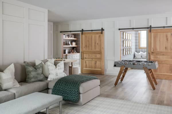 The home is complete with an upper-level family room, highlighting a massive flat-panel TV with integrated sound system and a wraparound sectional sofa that seamlessly combines into a gaming area with foosball and a gaming table. This level has two custom bunkrooms, each with built-in bunk beds, window seats, and custom cabinetry all accessible via sliding barn doors. The well-appointed bathroom has a separate large farm sink and is well suited to meet the needs of a larger, younger crowd. There is an ingenious ladder system that brings forth access to a secret loft area, making it the perfect hidden getaway space.