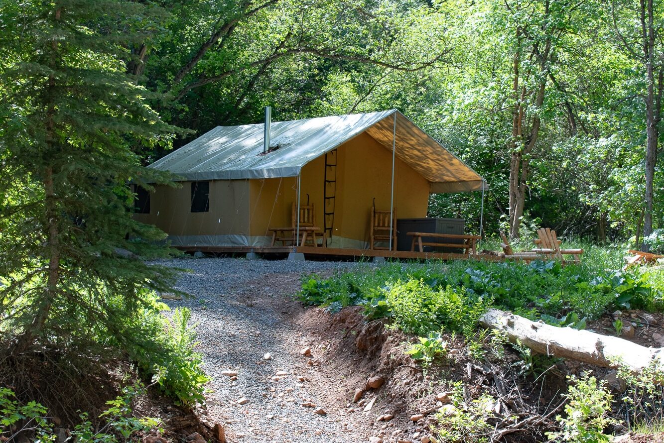 There is a backcountry campsite along Sheep Creek that features a wall tent with a wood stove situated on a custom deck. The camp is complete with a solar shower, outhouse, fire pit, and a wood-fired hot tub to soak under a star-filled sky amongst the Utah wildlife. This backcountry camp is a true destination, creating an amazing seasonal escape or the perfect base for a hunting camp in the fall.