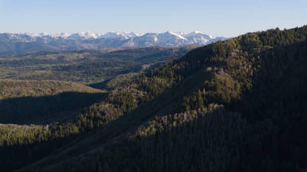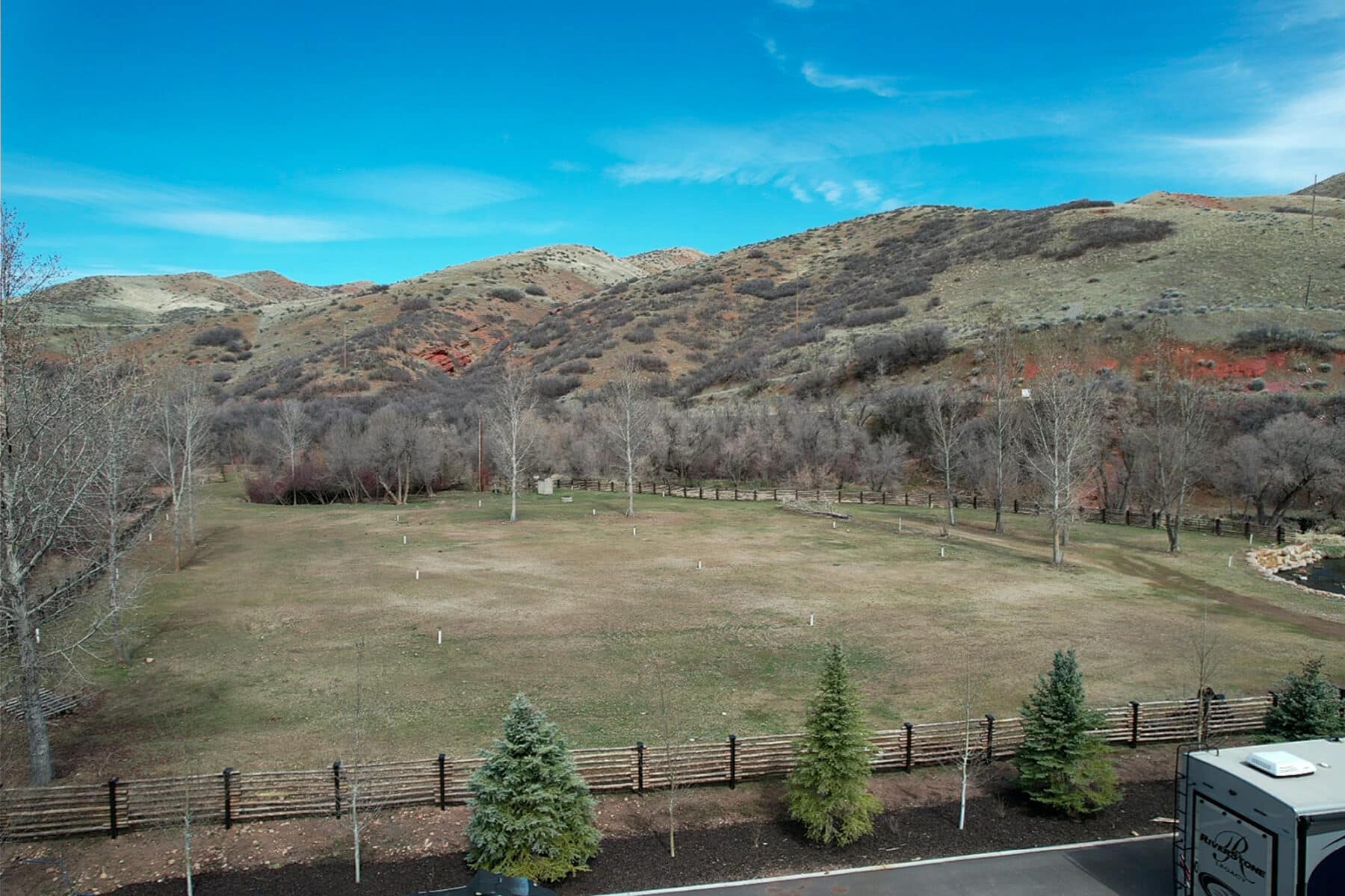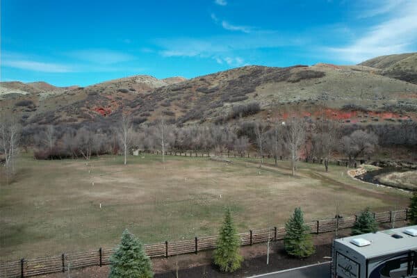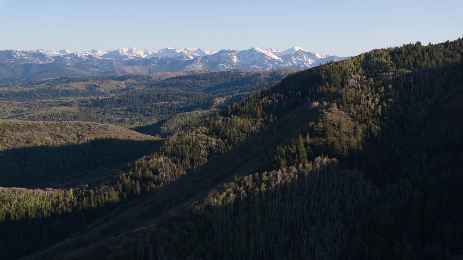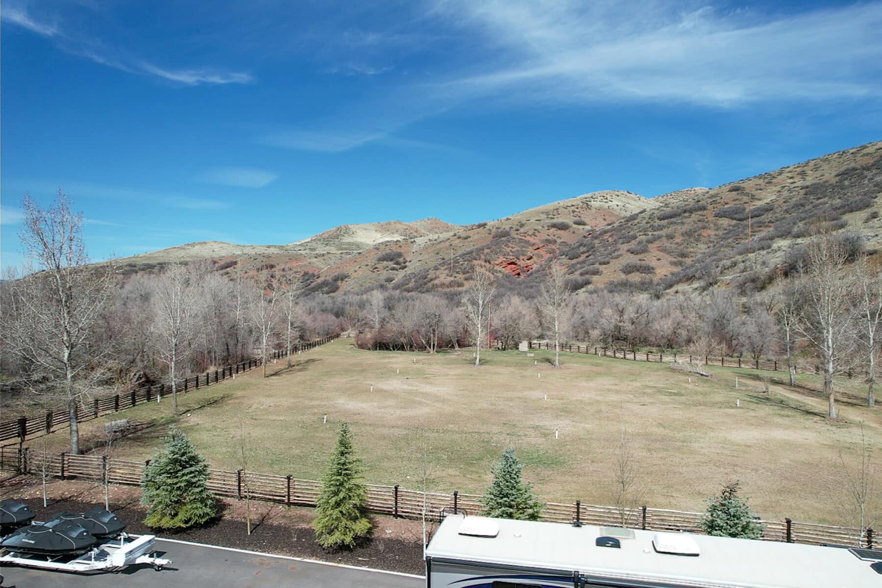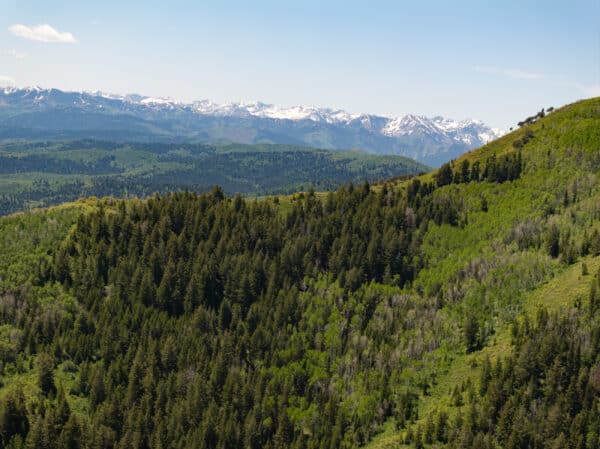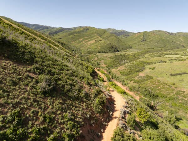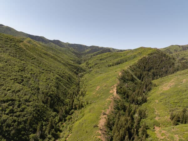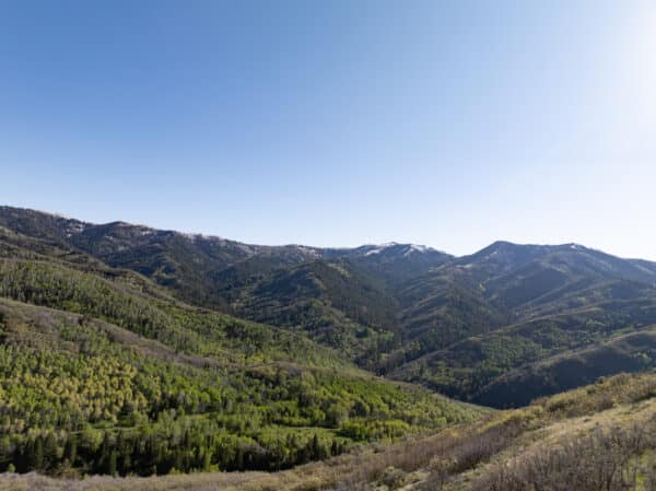 As you continue climbing near the southern border of the ranch, the journey gets more dramatic, and the expansiveness of the Sheep Creek Canyon experience completely sets in. There are several prominent ridgelines, and the highest point on the ranch is mapped at 8,376 feet in elevation. The views of the Wasatch Range to the west, regionally significant Lewis Peak to the east, and Park City to the south are some of the most spectacular you’ll encounter anywhere in Utah. The massive stands of aspen trees, scrub oaks, birch trees, cottonwoods, and dense stands of fir trees provide an incredible and ever-changing palette of colors throughout the seasons. The road network offers access to the elevated eastern portion of the ranch, which sits at about 7,500 feet and exposes a stunning bench overlooking the East Canyon Reservoir and mountain peaks on the horizon in every direction.