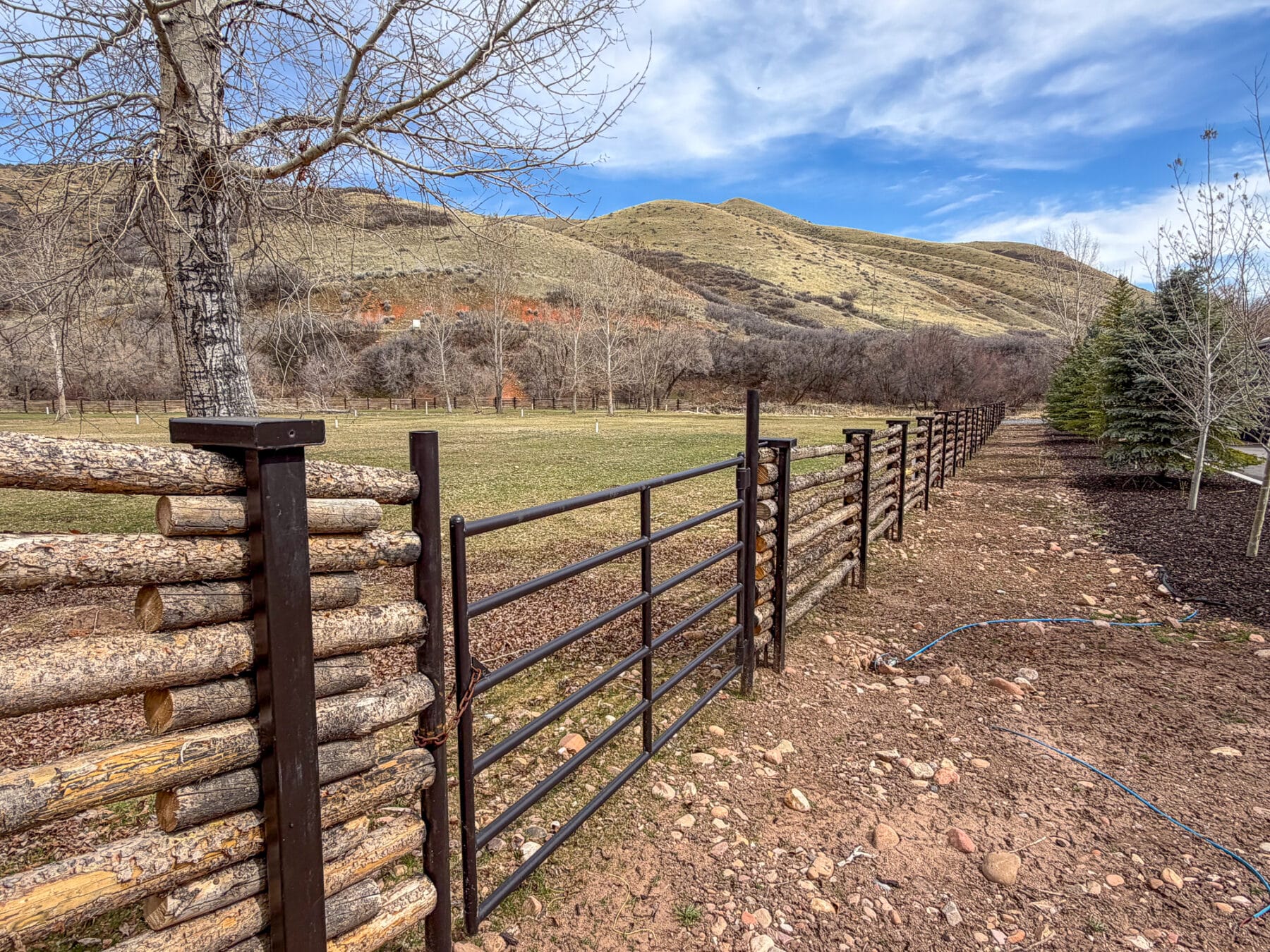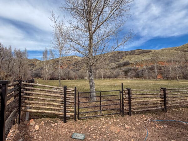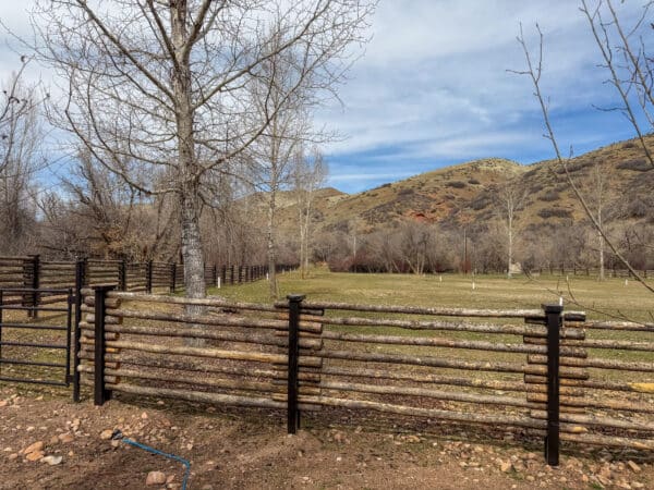 Adjacent corrals and turnout paddocks are newly fenced with a distinctive vertical bark on rail fencing system, offering secure, open-air grazing and turnout spaces that enhance both safety and visual appeal.