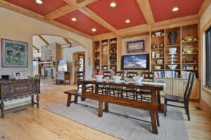 Adjacent to the kitchen, an open dining area with custom-built-in bookshelves opens onto a generous outdoor patio, overlooking the Bear River. Also located on the main floor is a well-appointed office and a guest suite with an attached bathroom.