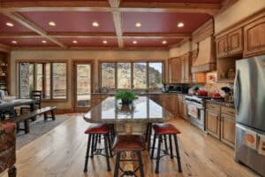 The main level welcomes you with soaring vaulted ceilings and expansive windows that flood the interior with natural light, framing breathtaking vistas. A stone fireplace anchors the great room, creating a warm and inviting focal point. The gourmet kitchen boasts high-end appliances and premier finishes, including granite countertops, custom cabinetry, and a spacious island ideal for entertaining.