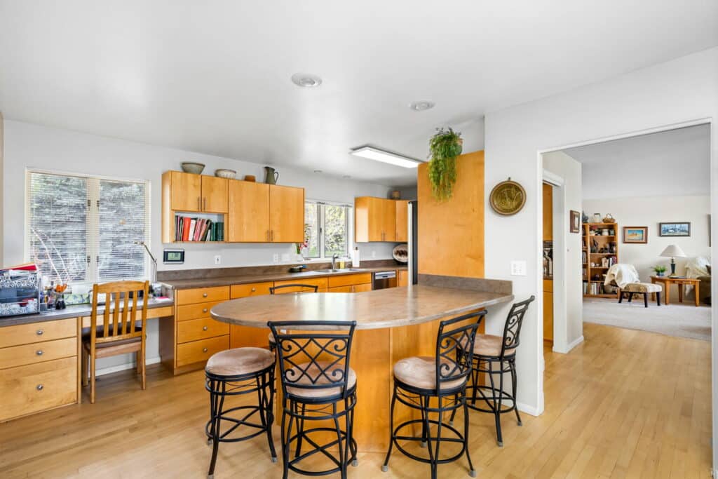 The heart of the home is its open-concept kitchen and living area, showcasing large windows that flood the space with natural light and provide stunning views of the property and the Sun River. The kitchen boasts maple cabinetry and a convenient kitchen peninsula, perfect for storage, additional counter space, and casual dining.