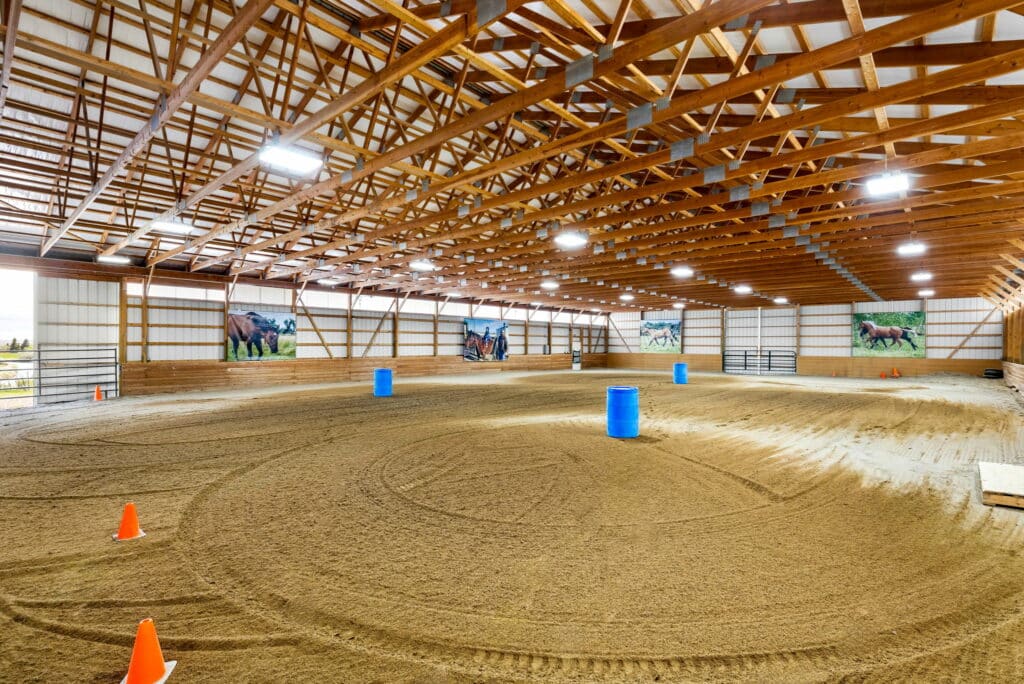 The arena’s roof is insulated, enhancing temperature control and energy efficiency. While the walls are currently uninsulated, they could be easily upgraded if desired. Notably, the arena’s open design, free of interior walls, allows for great flexibility. This feature makes it adaptable for various uses beyond equestrian purposes, should future needs change.